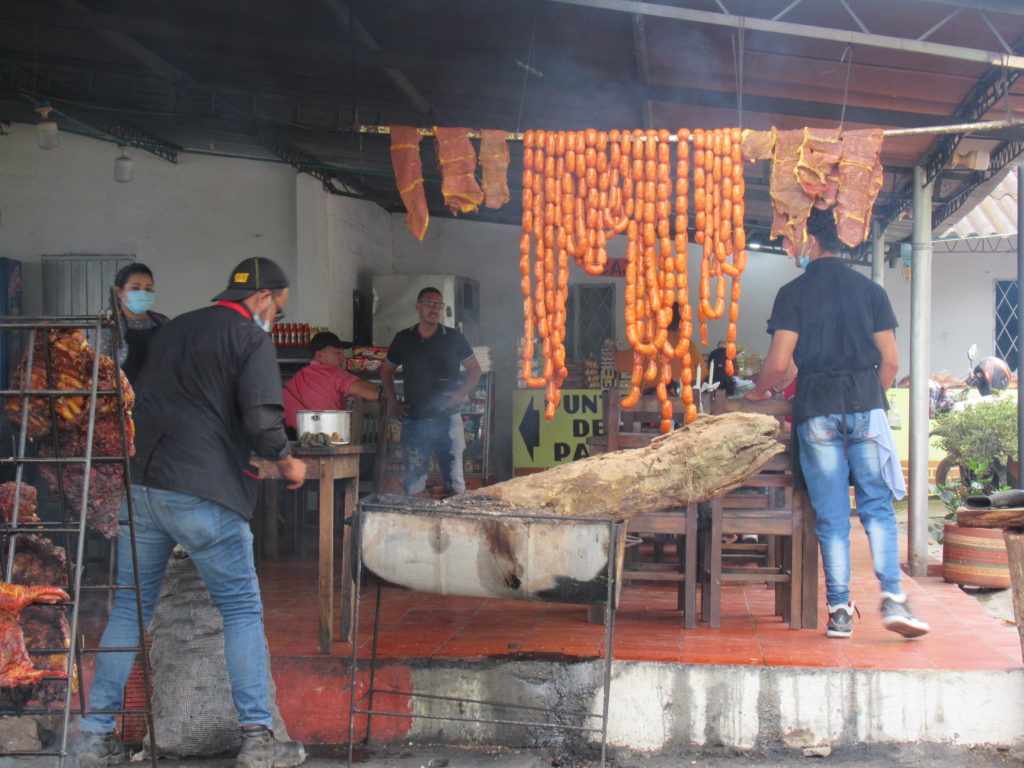 Photos : toutes les chats de Colombie sont en 3 couleurs (femelles) exclusivement, aucun n’a peur quand on s’approche pour les caresser. Dans le désordre. Un vendeur s’est arrêté au milieu du rond point, son client presque aussi.