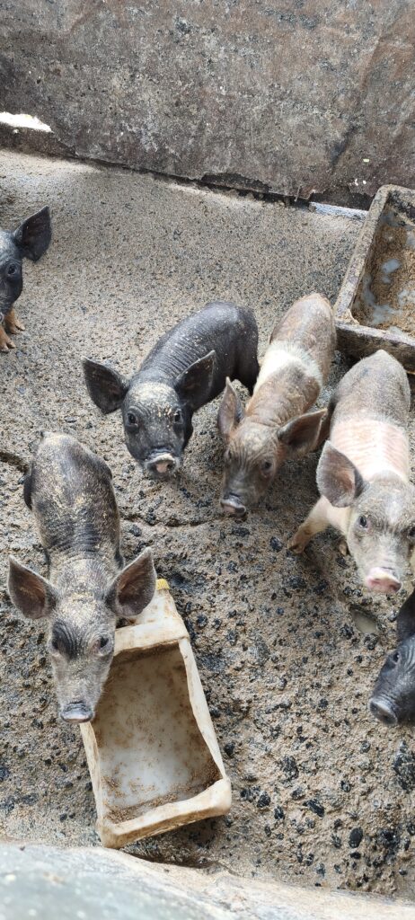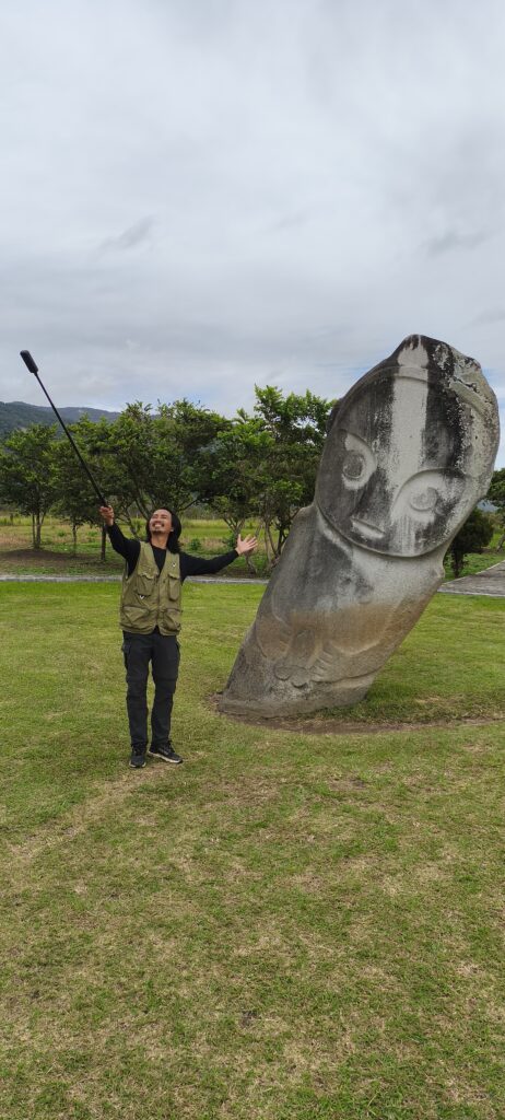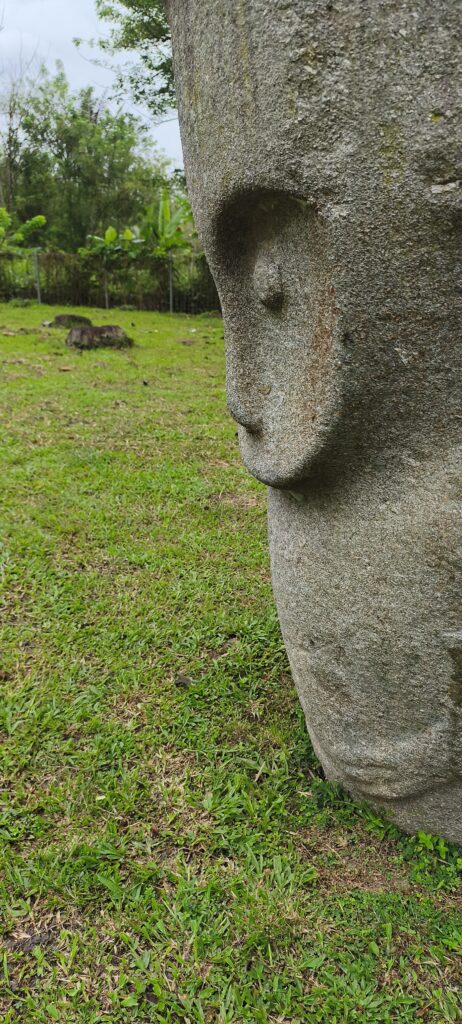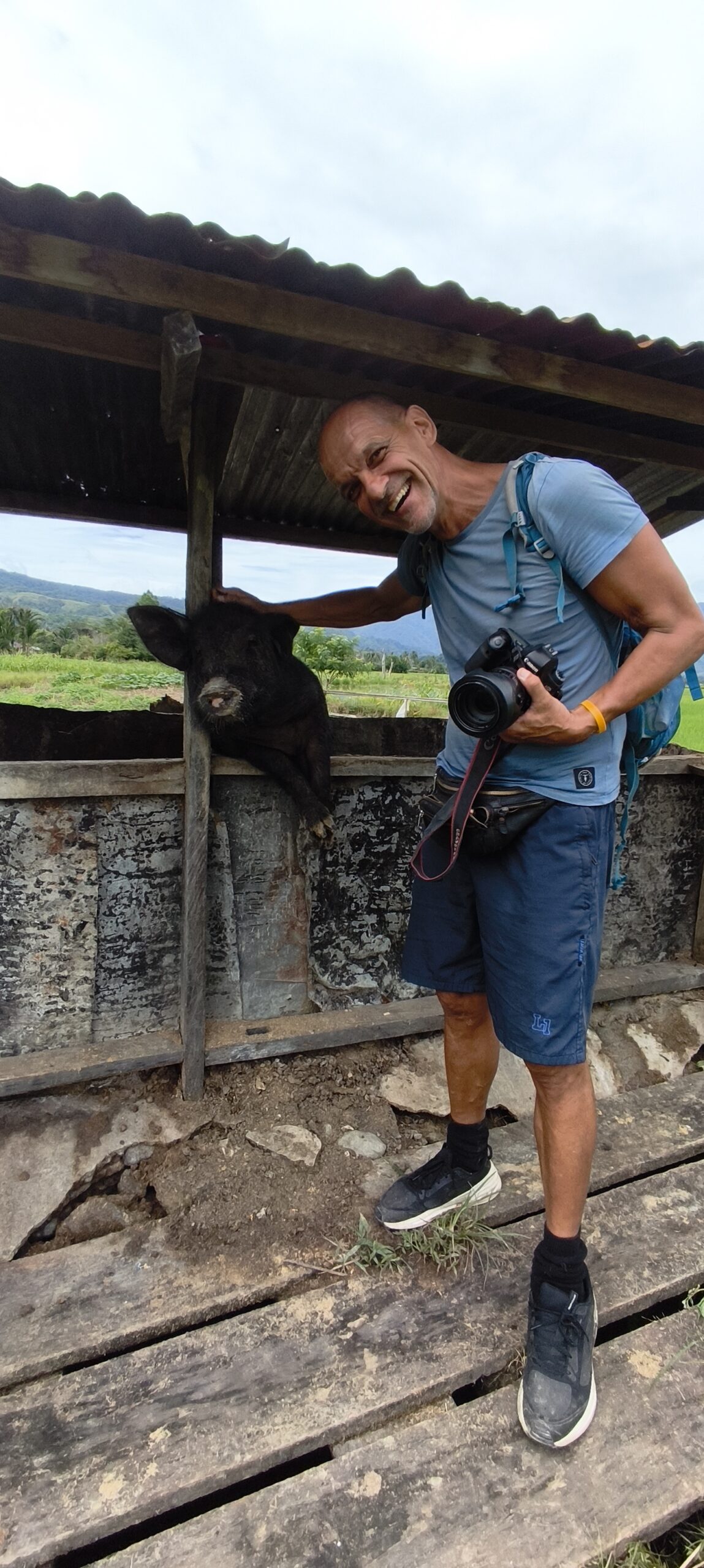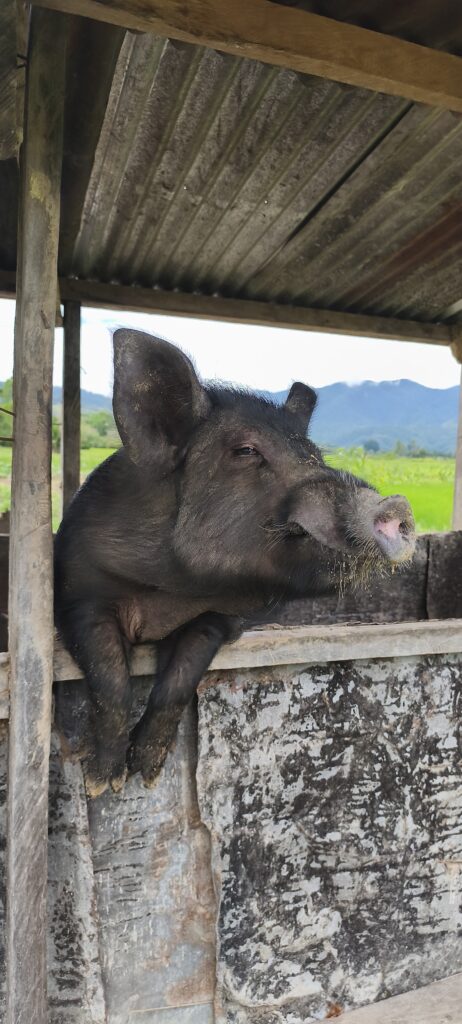 On fais le tour des champs et des rizières, car les statues sont très dispersées. Seule la plus grande est dans un parc aménagé. On se gare près d’un champ de cacaohiers. Il faut aussi caresser une truie au passage, mdr…