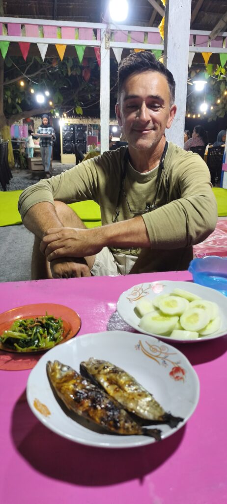 Exploration de la petite ville. On est en bord de mer. J’ai repéré une série de restaurants, paillotes en bord de plage. Je vais y manger avec le suisse, on va beaucoup discuter.