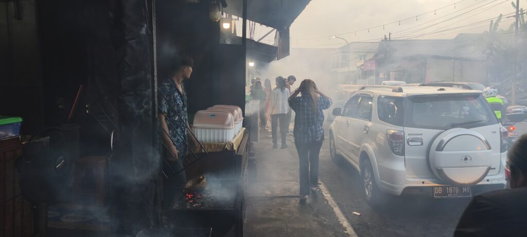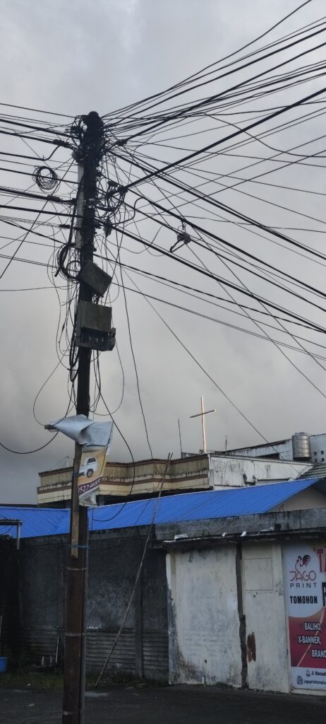 Sans trop de programme, je reste une journée de plus au frais, je vais remonter l’artère principale. Par contre jour de vraie pluie, je vais m’arrêter une première fois sous le préau d’une église longtemps, et plusieurs fois comme ça – 5km par étapes. Je fis la tête dans 2 restos car le plat demandé n’est pas disponible. Tout ça pour finir dans une chaîne pour obèses indonesiens. A l’abri. Je vais avoir la bonne idée de finir sur un massage justement à côté.