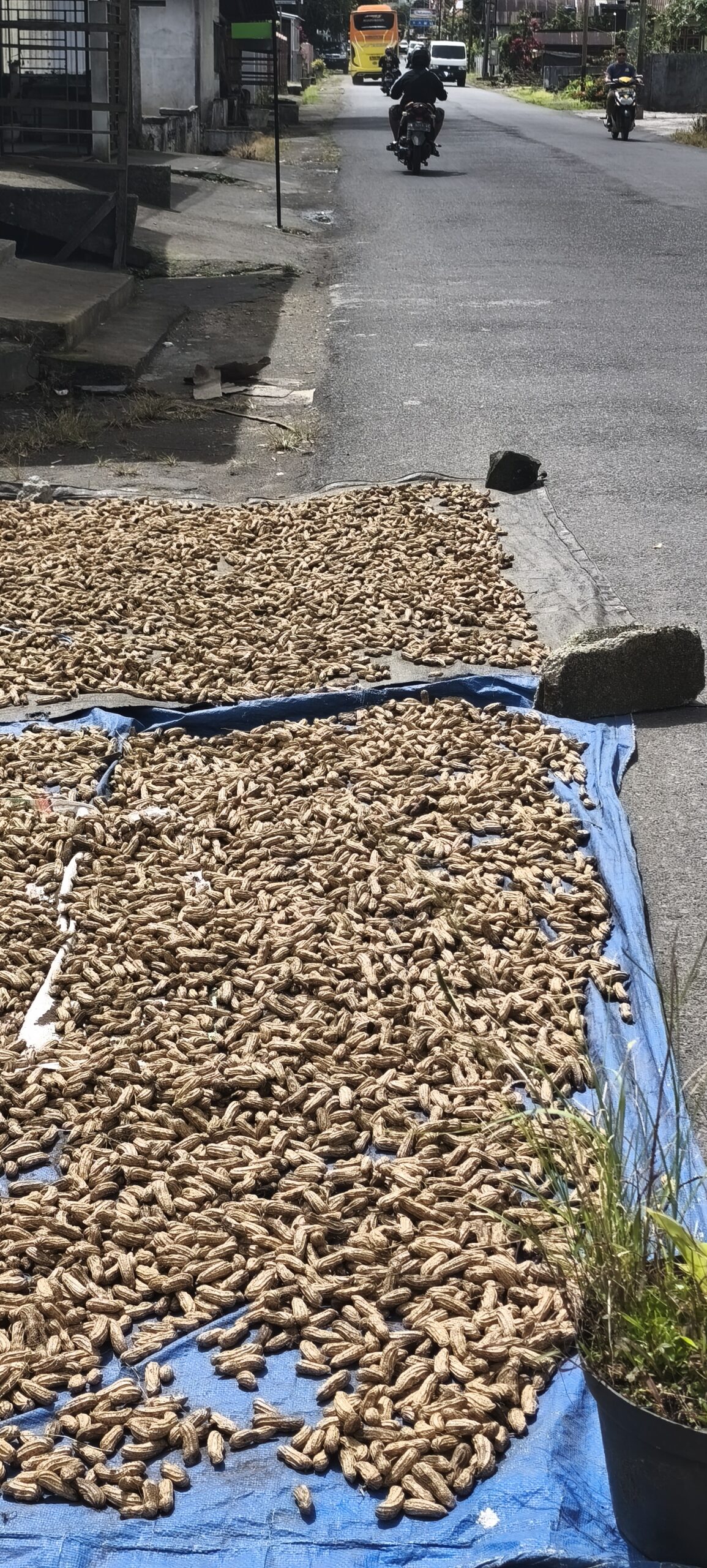 Il est midi, la potiere me recommande la ville suivante, « capitale de la cacahuète ». Top ! c’est le jour du marché, et là il va bien y avoir python etc. L’attraction c’est moi, trop sympa. Petite soupe au nouilles dans le mini resto. Longue route de retour et pas de pluie.