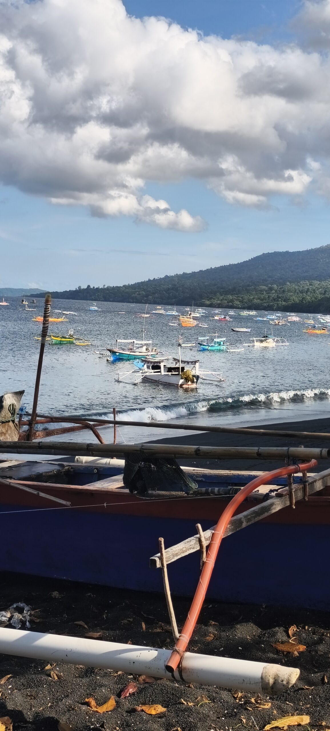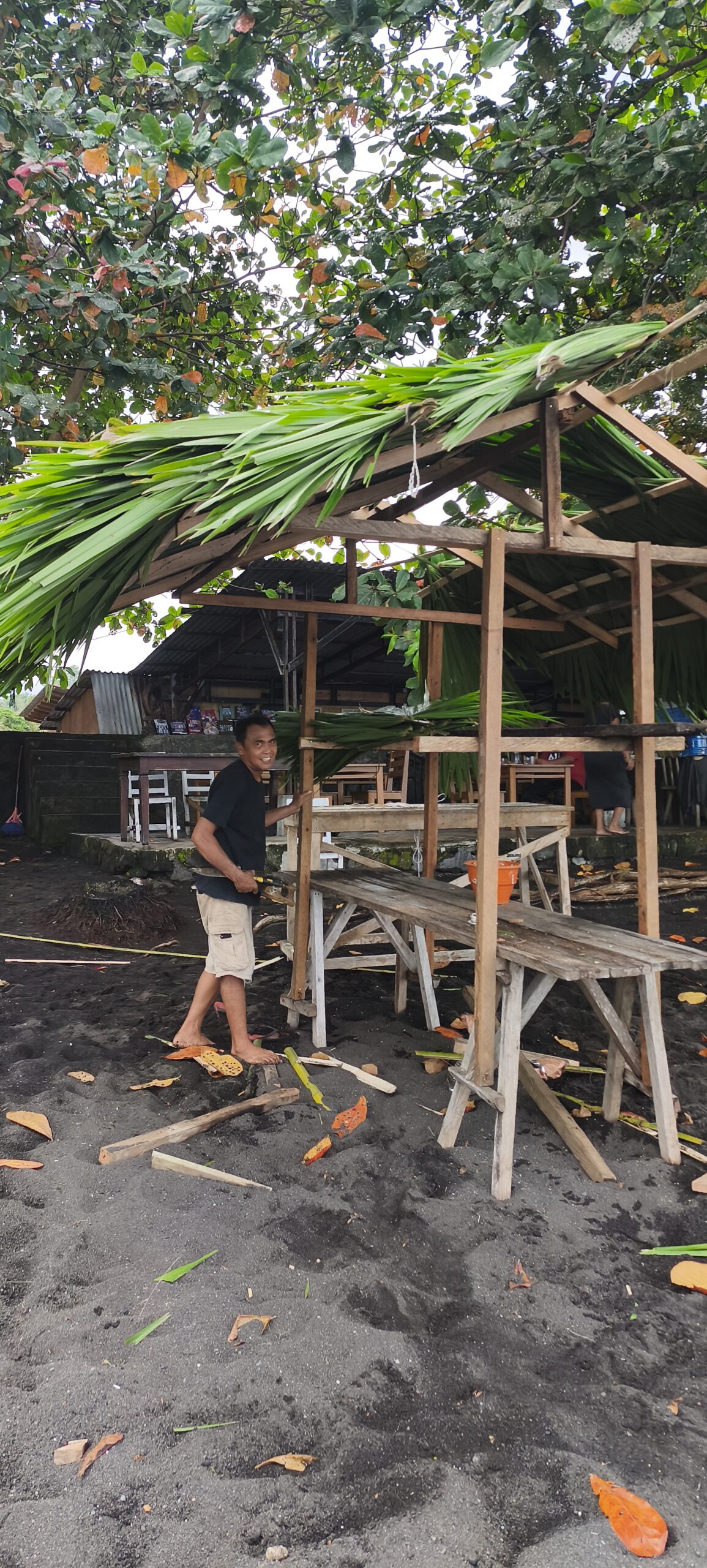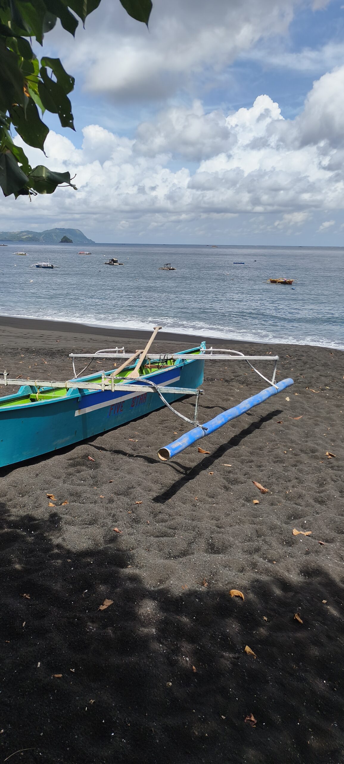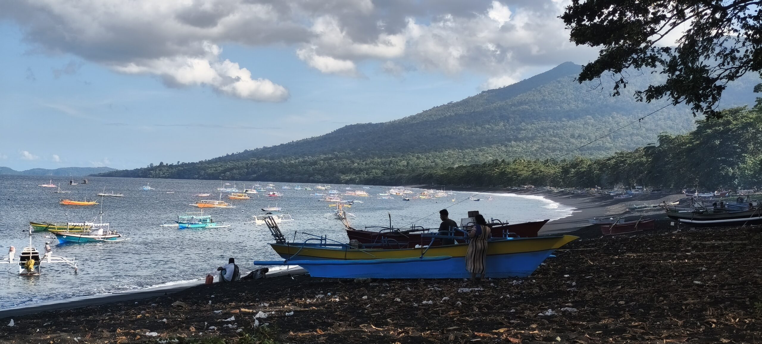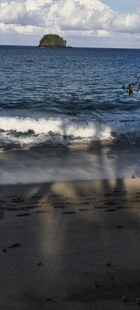 Il me semblait que l’on était situés à quelques kilomètres de la mer, en fait il suffit de traverser une partie du village. Il y a une grande baie de sable noir, les bateaux de pêche, et surtout une rangée de très grands arbres qui longe la digue, c’est magnifique en début d’après midi quand la plage commence à être à l’ombre. Il y a du monde à partir du milieu d’après midi (des villageois), les enfants se baignent, les pécheur partent en bateau.Le sable magnétique se colle au clapet du smartphone.