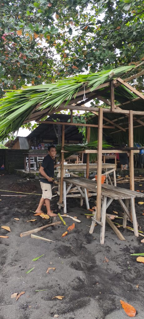 Petite baignade, il y a un fort ressac sur la plage pentue mais l’eau est chaude. Un petit resto rustique sur la plage est aussi cher qu’un resto chic de Tomohon, par contre j’y goûte un excellent cocktail citron/alcool de palme, ça a failli me manquer au bout d’un mois et demi.