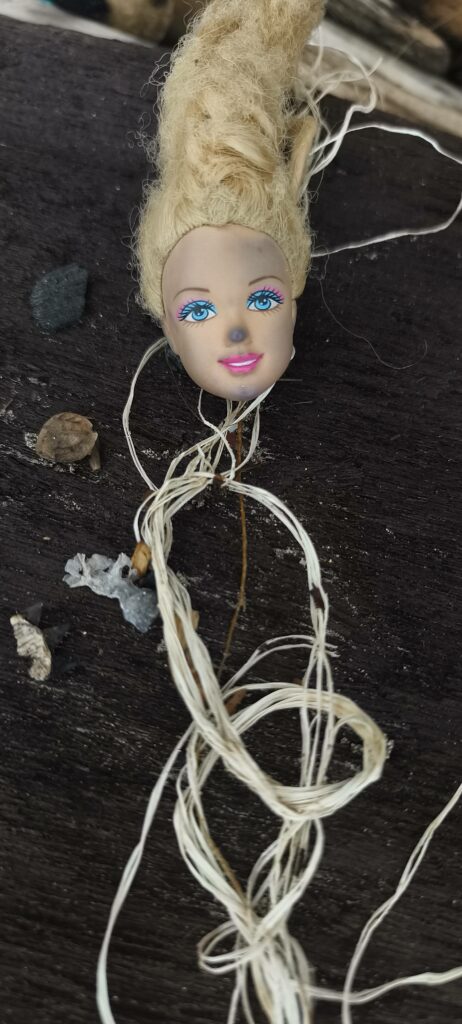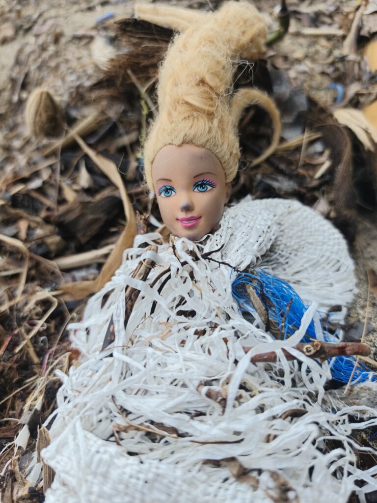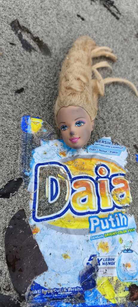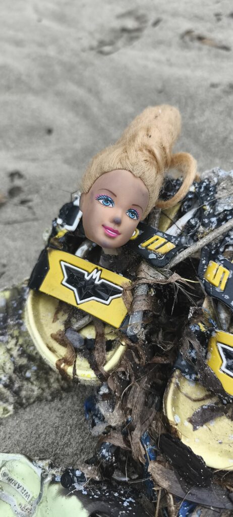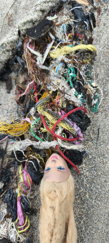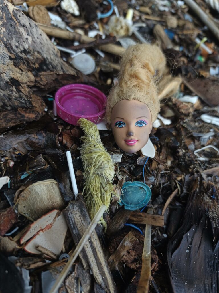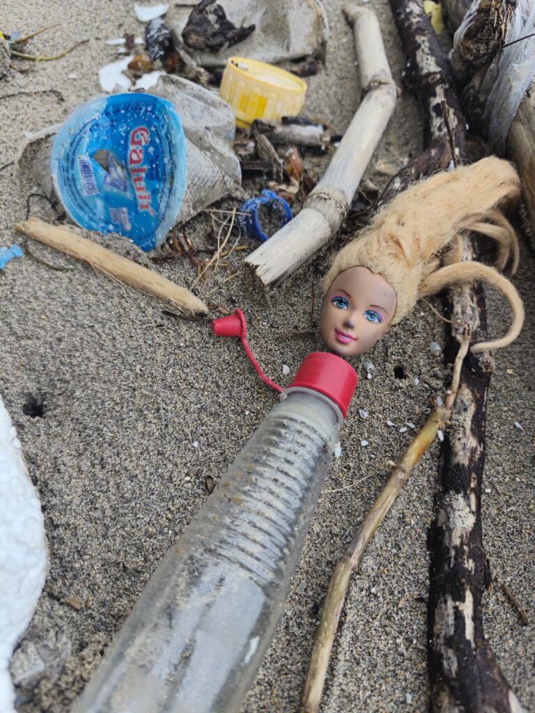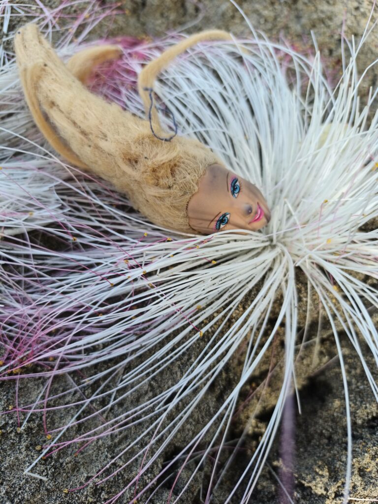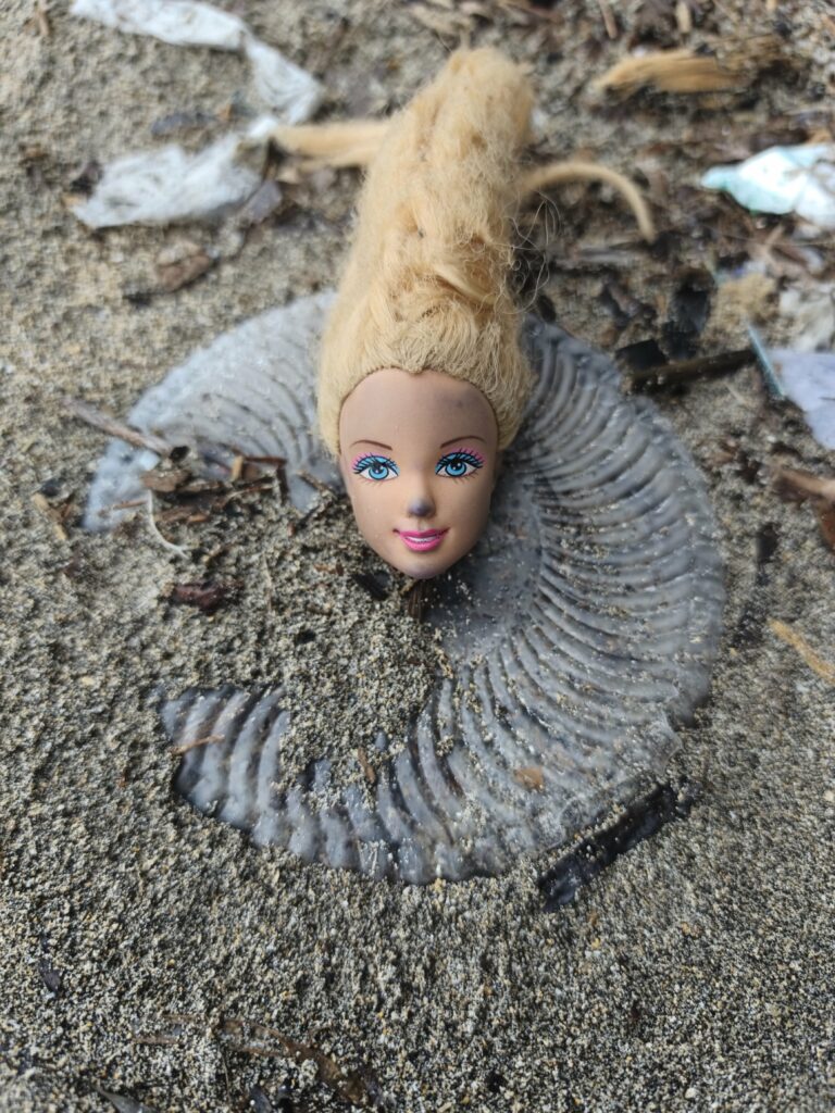 Petite séance photos de la poupée dans le sable de la plage avec un décor de pollution plastique incroyable. Le personnel gère le tonneau des Danaïdes, à devenir fou. Il ne faut pas regarder en dehors de leur périmètre.