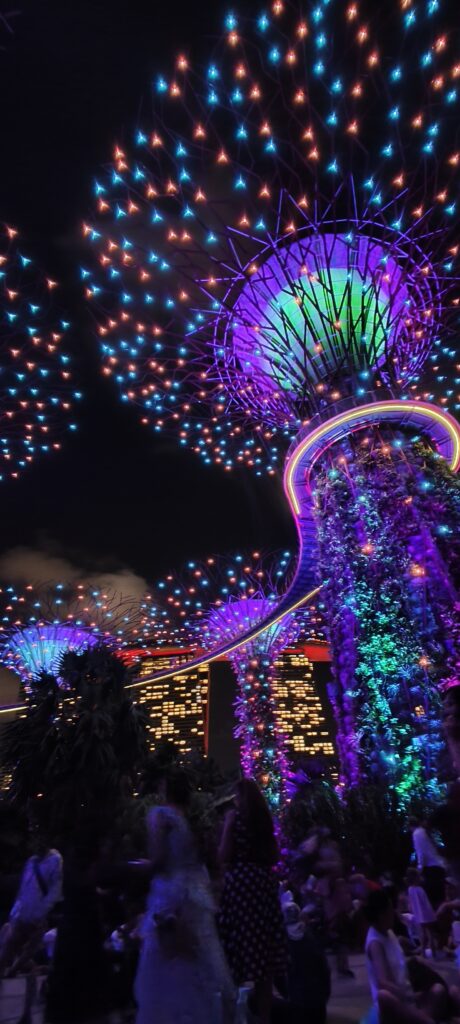 Pour le Supertree, c’est plutôt pas mal. Il y a deux spectacles, un long intermède avec musique planante, laser et brume. Et une grosse animation musicale avec de simples effets avec les éclairages couleurs des arbres. On peut dire que c’est photogénique, l’expérience agréable. J’ai mitraillé pendant les lasers, alors que quelques nuages blancs passaient.
