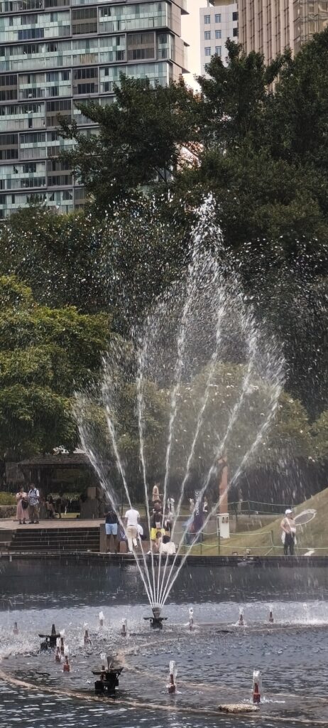 Jardins devant les tours, centre commercial. Vraiment comme à Dubaï. Fontaine musicale aussi. Je finis par reconnaître la photo du catalogue de mon fabricant de fontaines… Je connais très bien ce matériel, je pourrais y travailler directement..