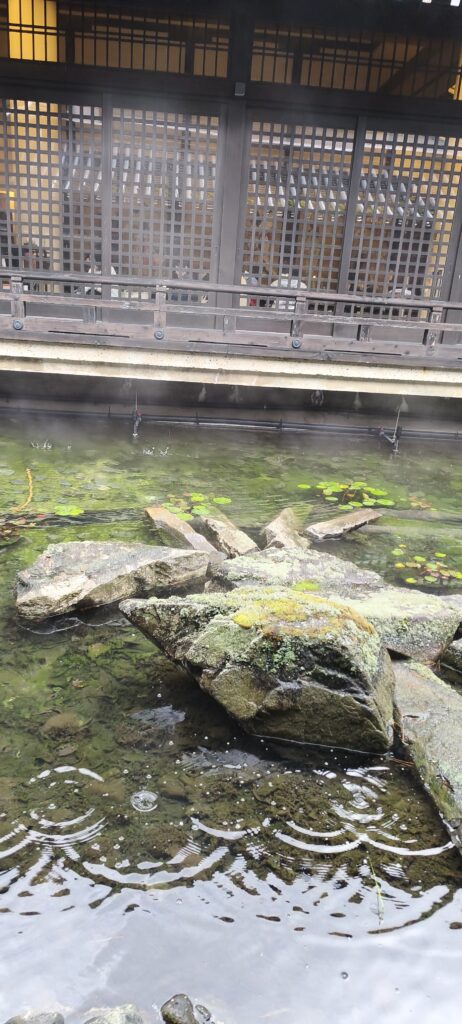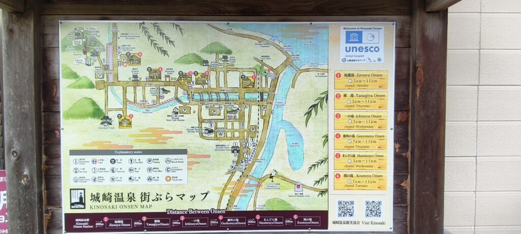 Dans la même vallée, il y a Kinosaki, c’est une ville thermale donc touristique, des vitrines et des restaurants. Il y a les hôtels chics et 6ou7 bains publics. Les gens se baladent en tenue de curiste officielle avec les sandales de bois, malgré le froid. J’en ai testé un.