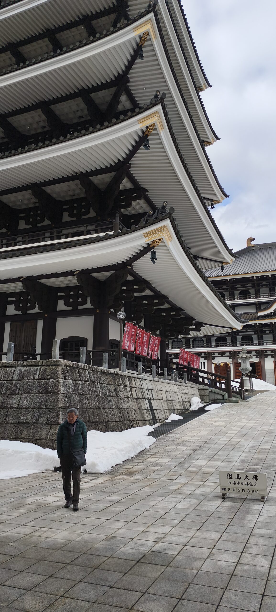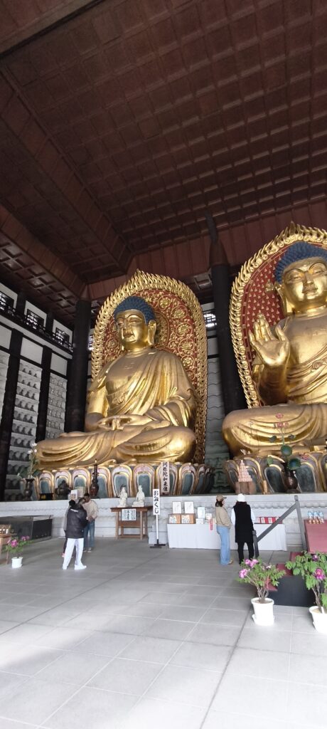 C’est bien par hasard que je m’arrête à un important temple bouddhiste, on ne peut pas le louper depuis la route. Choraku-ji 但馬大仏・川会山長楽寺. Un temple, hall géant, abrite 3 énormes statues de buddha géantes, des plus grandes du pays, en bois doré. Les murs couverts ne niches avec des statues. Comme d’habitude, j’arrive peu avant la fermeture. C’est vraiment à voir.