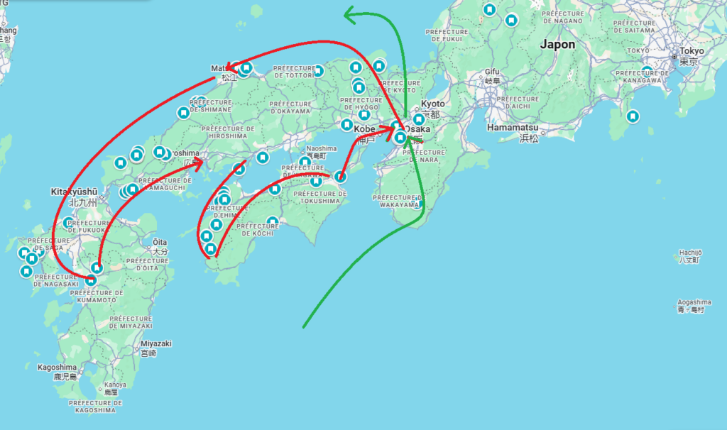 22 mars 2025 Journée de m pour visiter le mémorial. Pluie toute la journée. J’ai gardé mon pied à terre entre deux villes, donc il faut faire de la route pour me rendre en ville. Je constate que Nagasaki est une grande ville, je fais mon tour pour garer la voiture, c’est un peu compliqué…
