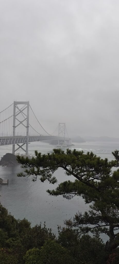 J’atteins le bout de l’île. Naruto. Le pont relie un îlot intermédiaire : c’est une attraction touristique. Mais ce sera sous la pluie. A force je loupe le musée qui est dans le parc.