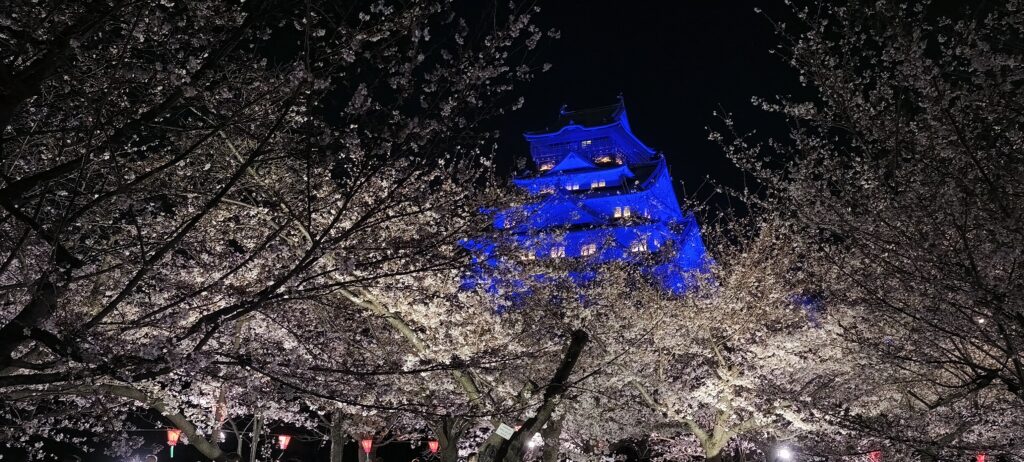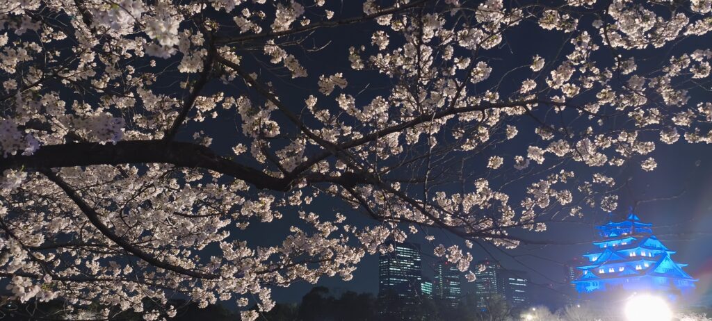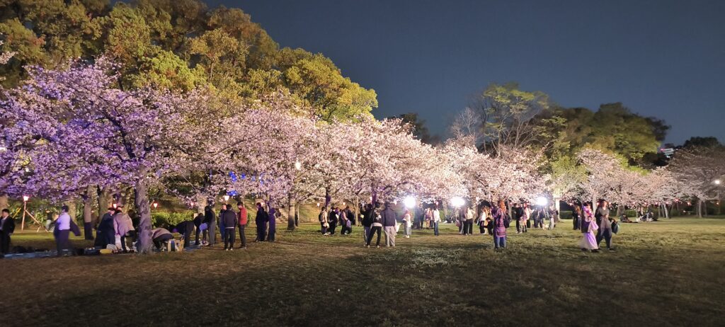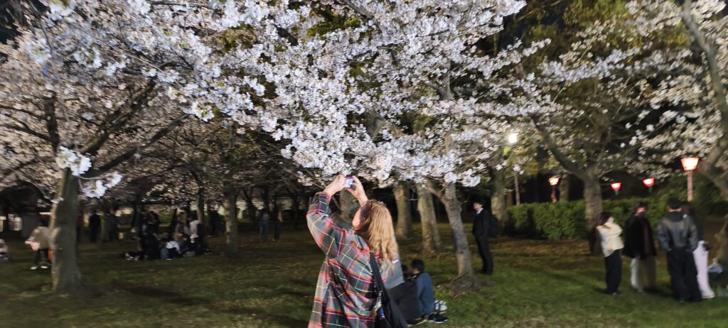 Soirée sur le parc du château, j’arrive bien-sûr peu avant la fermeture mais ça passe. Il y a du monde et encore j’ai dû éviter l’heure de pointe. Les cerisiers sont éclairés, le gens pique niquent sous les arbres, sinon c’est selfies selfies selfies. C’est quand même à voir avec le château éclairé. Voir également les douves et les murailles.